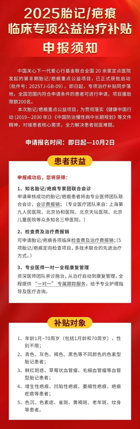 由中国关心下一代爱心行基金联合全国20余家定点医院发起的第Ⅲ期胎记/疤痕重点诊疗公益项目,已正式获批启动。专项治疗补贴同步落地,全国范围内符合条件的患者可进行申请,限额200人。